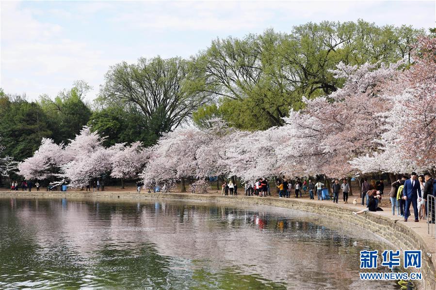 4月7日,人们在美国首都华盛顿的潮汐湖畔欣赏樱花。 新华社记者 韩芳 摄