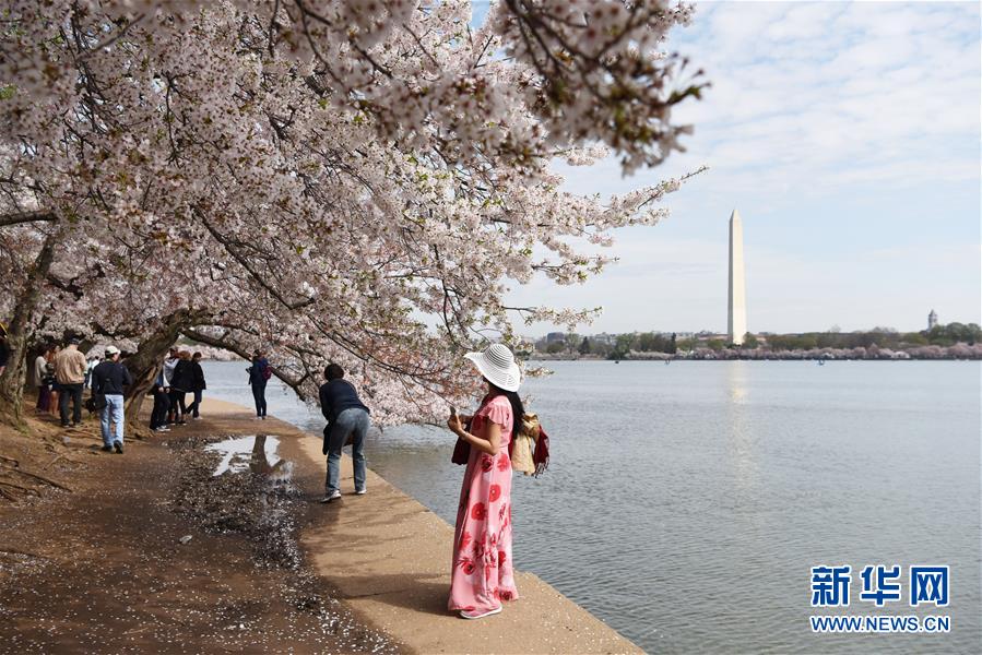 4月7日,人们在美国首都华盛顿的潮汐湖畔欣赏樱花。新华社记者 韩芳 摄