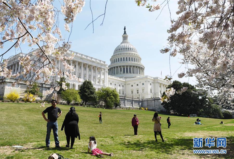 4月6日,人们在美国首都华盛顿的国会山欣赏樱花。新华社记者 韩芳 摄