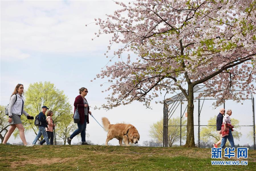 4月7日,在美国首都华盛顿的潮汐湖畔,人们经过盛开的樱花。新华社记者 韩芳 摄