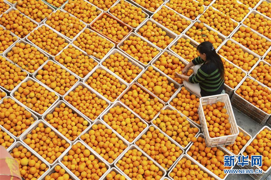 4月9日,秭归县郭家坝镇郭家坝村村民对新采摘的脐橙进行筛选准备出售。近年来,湖北省宜昌市秭归县大力发展晚熟脐橙品种,春季是晚熟脐橙品种上市期,也是下一季脐橙开花、坐果期,花果同枝的景象吸引众多游客前来观赏采摘。 新华社发(雷勇 摄)