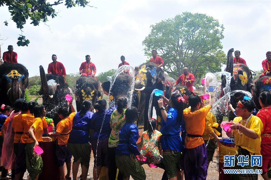 4月11日,在泰国大城府举行的庆祝活动上,大象向游客喷水。 当日,泰国古都大城府举行庆祝活动,迎接即将到来的泰历新年“宋干节”。 新华社发(拉亨摄)