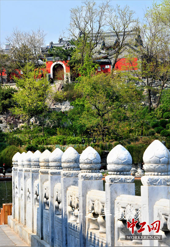 北京汇通祠位于什刹海西海西北小岛上。明永乐年间始建,旧称法华寺,因祠庙迎水、临水,明代时称之为镇水观音庵。祠庙坐落于什刹海入水口的环形土山之上,土山正对着城墙水关,西山诸泉自水关入后,沿环形土山流入什刹海。因修建二环路及地铁时,汇通祠曾被拆除。近些年汇通祠被重新恢复,并设有中国元代杰出的天文、水利、仪器仪表制造专家郭守敬纪念馆。图为2019年4月11日的北京汇通祠。工人日报-中工网许之丰摄影报道