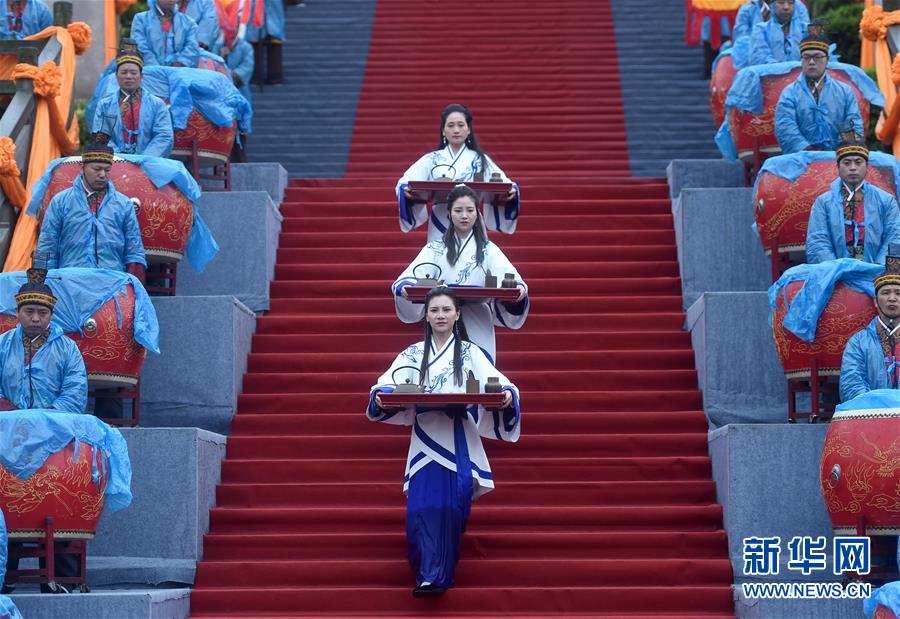 4月11日,演员在新昌大佛龙井茶文化节茶祭大典上表演。当日,为期两天的新昌大佛龙井茶文化节在浙江省新昌县开幕。此次茶文化节将举办茶叶博览会、斗茶会、茶王大赛、茶祭大典等活动。 浙江省新昌县有着悠久的产茶历史。2018年,新昌县茶叶产量达5200吨、总产值8.9亿元。新华社记者 韩传号 摄