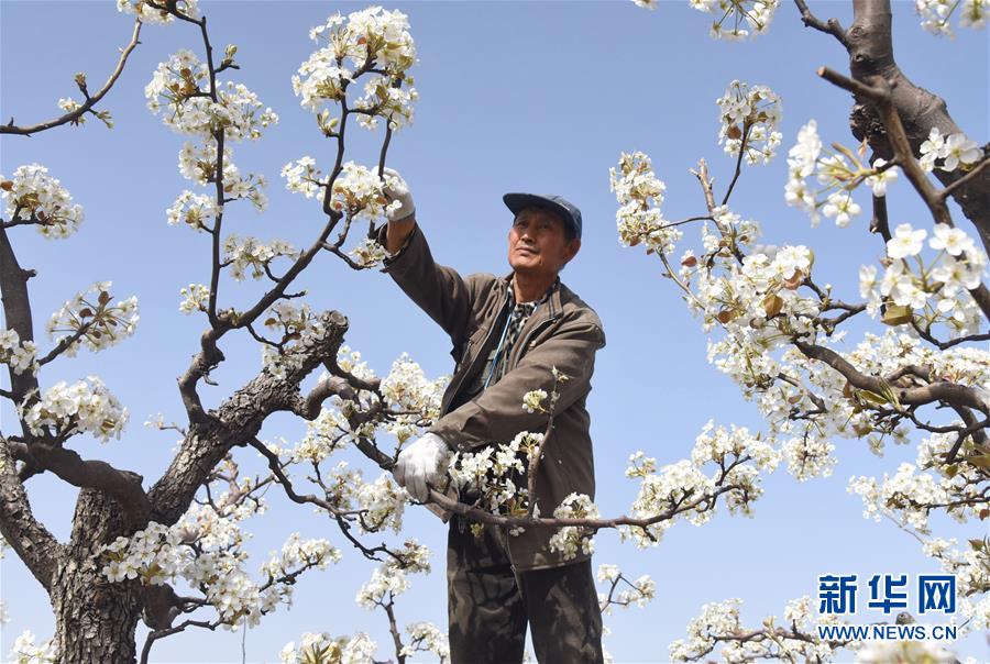 4月12日,河间市龙华店乡兴隆店村果农在梨园为梨花授粉。眼下,河北省河间市龙华店乡2100余亩梨树进入花期,当地果农抢抓农时为梨树进行人工授粉。 新华社记者 朱旭东 摄
