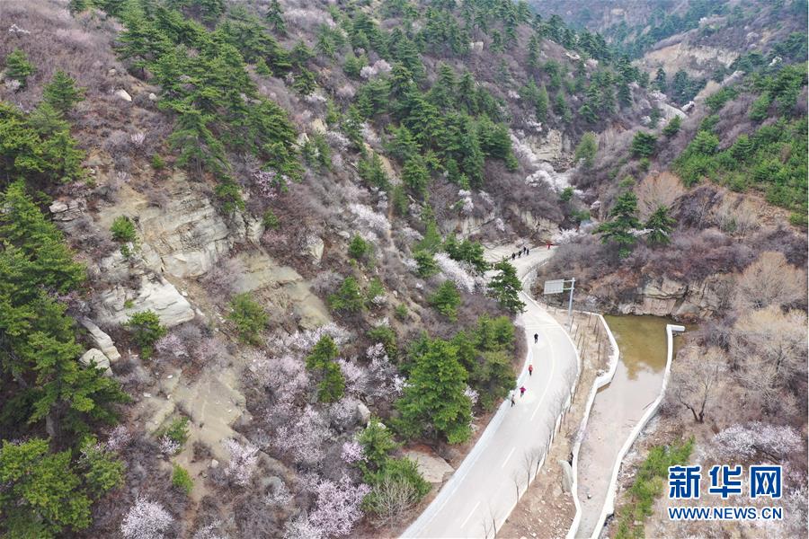 4月12日,游客在桃花沟游览(无人机拍摄)。 位于山西省太原市万柏林区小虎峪村的桃花沟,曾是一处荒山沟。近年来,当地大力开展生态修复,并依托漫山遍野的山桃花资源开发旅游项目。随着天气转暖,桃花沟里的山桃花竞相开放,吸引众多游客前来观赏。 新华社记者 杨晨光 摄