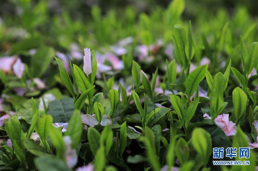 4月12日,“万亩茶海”内掉落的樱花和茶树相映成趣。 近日,位于贵州省湄潭县永兴镇的“万亩茶海”春色怡人,呈现出一幅美丽的春季画卷。据了解,该茶海连片种植面积达4.3万亩。 新华社记者 刘续 摄