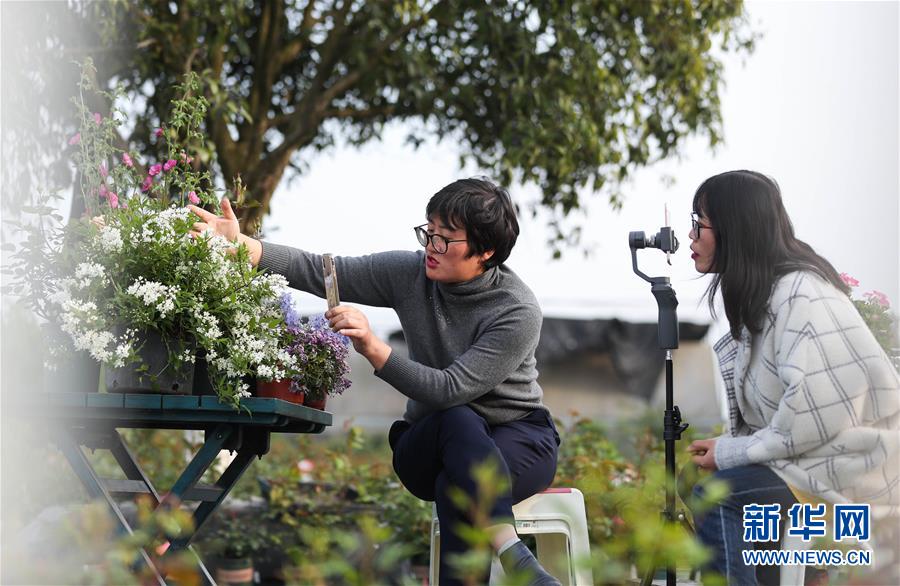 4月11日,在成都市双流区彭镇“海妈”的苗圃基地,“海妈”(左)在进行网上直播。 新华社记者 江宏景 摄