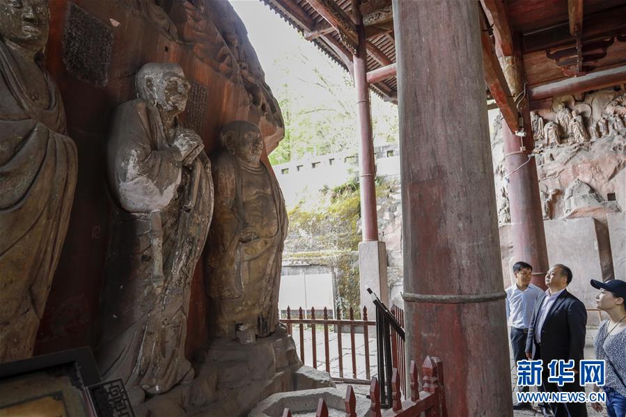 游客在涞滩古镇的二佛寺参观古代摩崖造像(4月11日拍摄)。位于重庆市合川区的涞滩古镇始建于宋代,三面悬崖峭壁,一面渠江流淌,是首批中国历史文化名镇、中国十大古镇、首批“中国最美的村镇”。涞滩古镇自然风光优美,明清民居高低错落,老街小巷古朴典雅,清代修筑的防御设施瓮城至今仍保存完好。 新华社记者 刘潺 摄