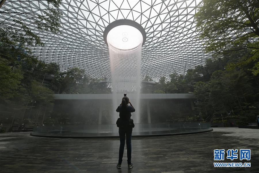 4月11日,一名记者在新加坡樟宜机场拍摄“星耀樟宜”。 “星耀樟宜”位于新加坡樟宜机场的中心位置,是一座集机场设施、景观花园、购物休闲、酒店餐饮等多功能于一体的综合性建筑,于11日至16日开放给公众预览,并将在17日正式启用。 新华社发(邓智炜摄)
