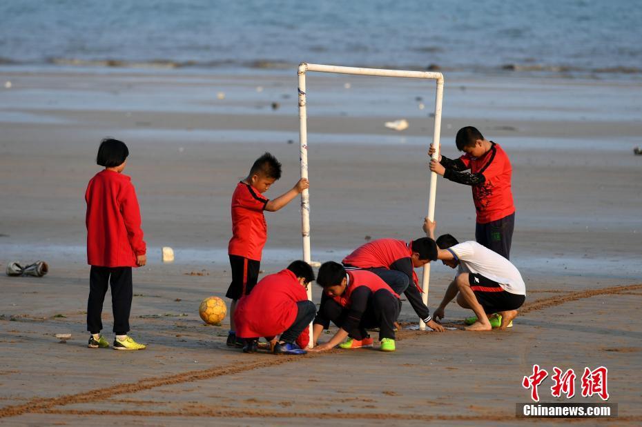 福建省霞浦县下浒镇是一个靠海的乡镇,美丽的沙滩吸引了许多游客前来观光。33岁的陈龙强是当地的一个瓷砖店老板,从小就喜欢踢球的他在2016年组建了一只“长风足球队”,队员主要是当地小学的学生。对于“长风足球队”的孩子们来说,快乐并不复杂。一片沙滩,用树枝画成的边线,用装修水管组装的球门,一个“百元足球场”就此诞生。但随着一声哨响,足球滚动,孩子们的欢声笑语却盖过了海涛的轰鸣。图为4月9日,陈龙强(白衣)与球员一起在沙滩上搭建球门。中新社记者 王东明 摄