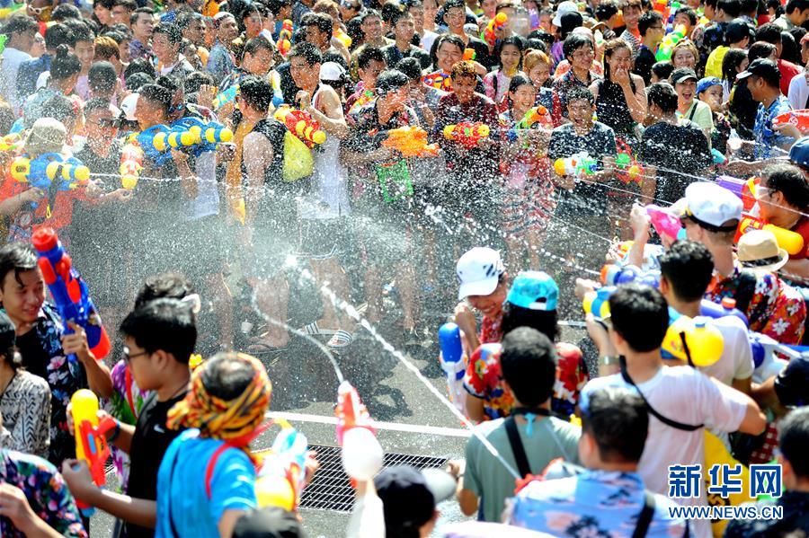 4月13日,在泰国曼谷,人们参加泼水狂欢活动庆祝宋干节。宋干节又称泼水节,是泰历传统新年。人们通过到寺庙祈福、用清水洗濯佛像、互相泼水祝福等方式庆祝这一传统节日。 新华社发(拉亨摄)