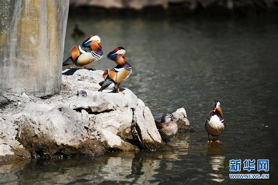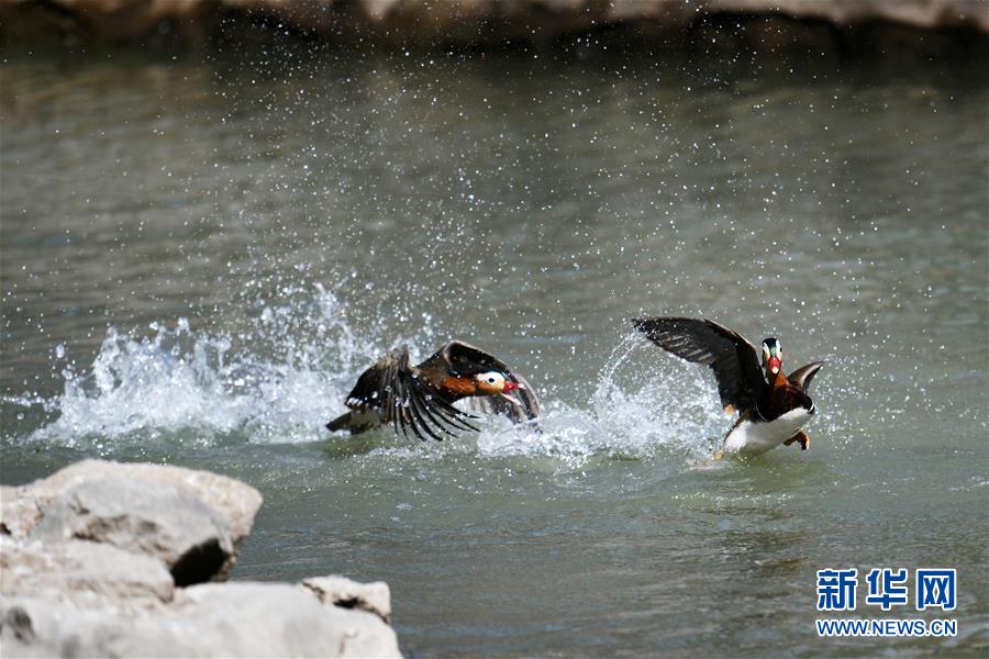 4月15日, 在哈尔滨兆麟公园的鸳鸯湖中,鸳鸯在追逐嬉戏。 近日,黑龙江省哈尔滨市兆麟公园陆续迎来北归的数十只鸳鸯,这些鸳鸯在湖中畅游嬉戏,构成一幅生机盎然的“鸳鸯戏春图”。 新华社记者王建威摄
