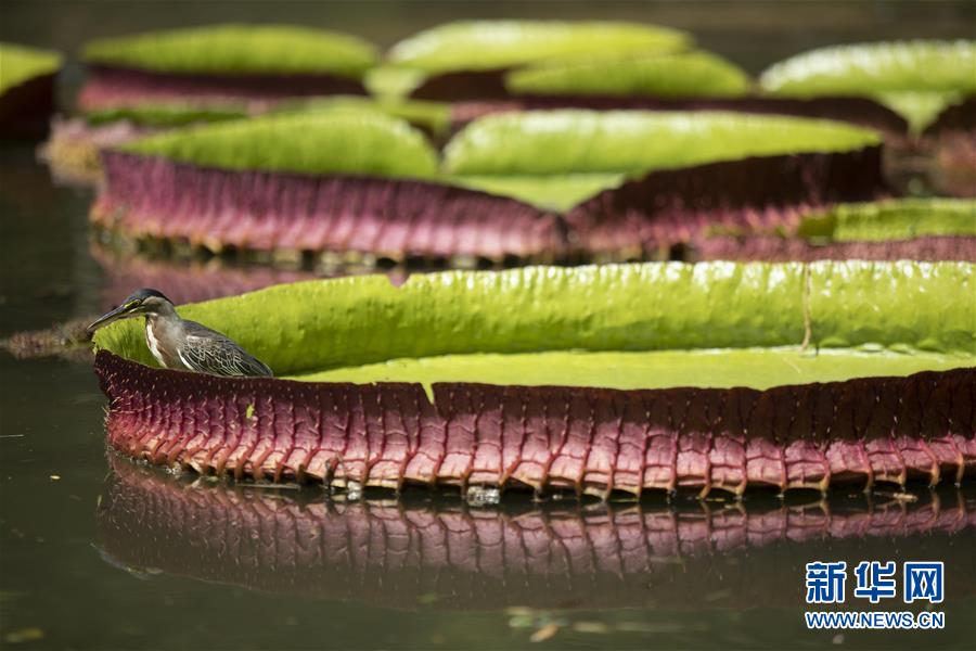 3月27日,在巴西里约热内卢植物园,一只鸟停在王莲上。 新华社记者李明摄