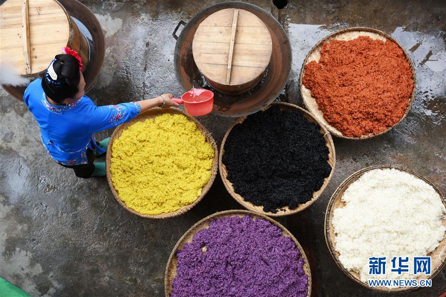 4月17日,在贵州省台江县姊妹街哆蝶五彩姊妹饭体验店,苗家妇女在蒸煮五彩“姊妹饭”。新华社记者 杨文斌 摄