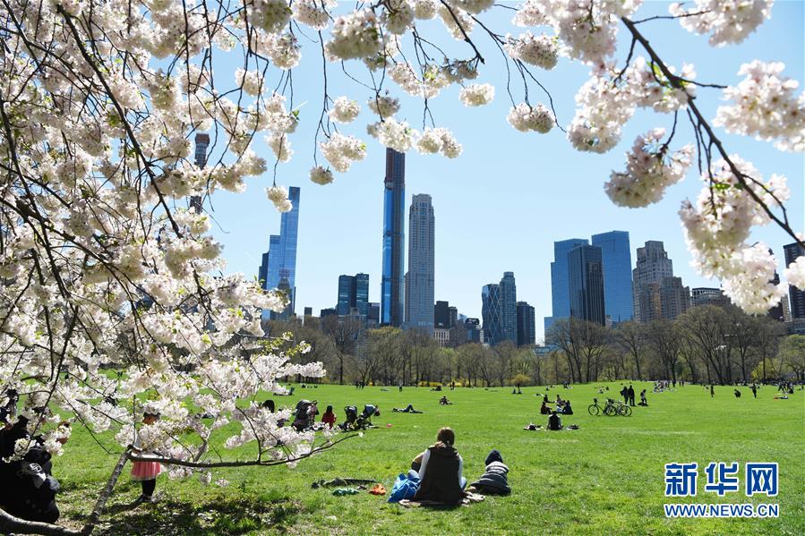 4月16日,人们在美国纽约中央公园的草坪上休憩。随着气温回暖,4月的纽约告别了漫长冬季,春花烂漫,生机盎然。 新华社记者韩芳摄