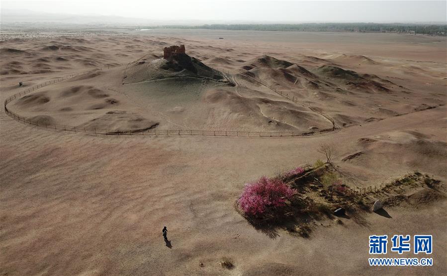 4月18日无人机拍摄的阳关烽燧遗址和盛开的桃花。近日,位于甘肃省敦煌市阳关烽燧遗址附近的几株桃树花开正艳,给荒凉的戈壁大漠增添了一抹亮色。新华社记者 马宁 摄