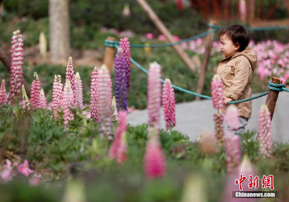4月19日,儿童在北京玉渊潭公园南部的“樱落花谷”新景区观赏鲁冰花。玉渊潭公园共栽植鲁冰花10万株,其中“樱落花谷”新景区7万株,“樱花园”景区3万株,预计5月初将进入最佳观赏期。中新社记者 杜洋 摄