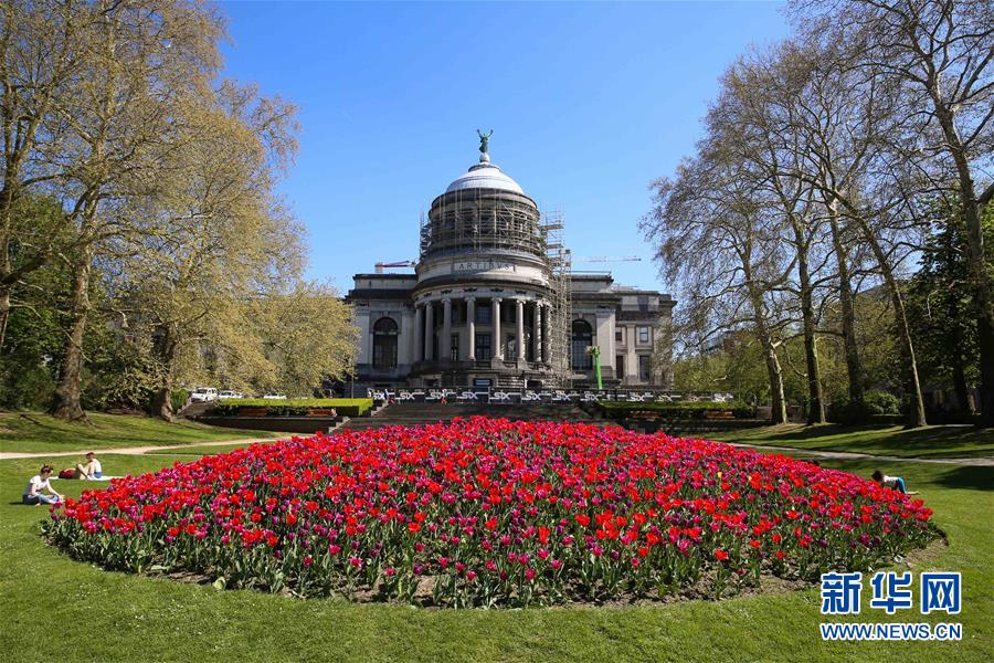 4月19日,人们在比利时布鲁塞尔的五十周年纪念公园享受春光。