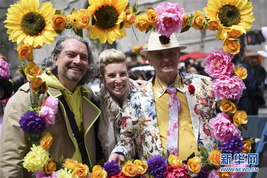 4月21日,在美国纽约,人们在复活节花帽游行上拍照。当日是西方传统节日复活节,人们穿戴色彩缤纷、创意十足的服饰和花帽,在纽约第五大道参加一年一度的花帽游行。 新华社记者 韩芳 摄