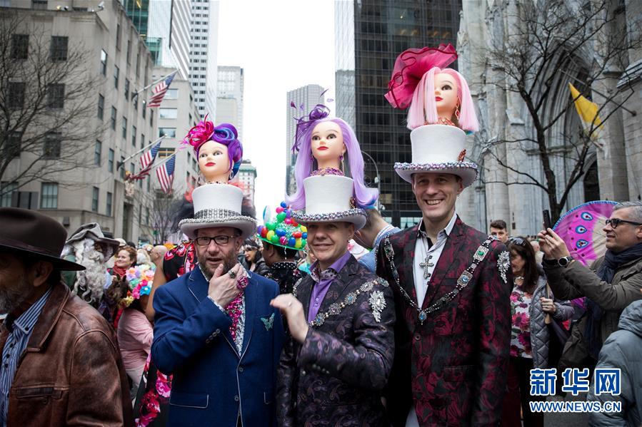 4月21日,在美国纽约,人们盛装参加复活节花帽游行。当日是西方传统节日复活节,人们穿戴色彩缤纷、创意十足的服饰和花帽,在纽约第五大道参加一年一度的花帽游行。 新华社发(郭克摄)