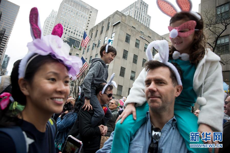 4月21日,在美国纽约,人们参加复活节花帽游行。当日是西方传统节日复活节,人们穿戴色彩缤纷、创意十足的服饰和花帽,在纽约第五大道参加一年一度的花帽游行。 新华社发(郭克摄)