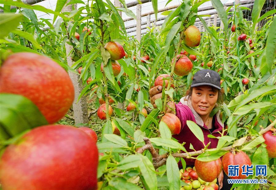 4月20日,唐山市曹妃甸区九农场青沱村一位村民在自家大棚内采摘油桃。 近年来,河北省唐山市曹妃甸区引导农民种植特色果蔬,并将农业与旅游、采摘深度结合,实现农业转型升级。据介绍,目前该区建设高标准温室大棚7915个,面积近三万亩,年产值达2.1亿元。 新华社记者杨世尧摄
