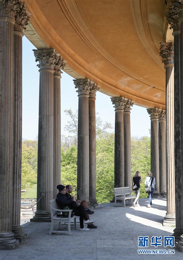 无忧宫位于德国首都柏林西南的波茨坦,是为当时的普鲁士国王腓特烈二世建造的一座洛可可式宫殿。全部建筑工程前后延续了约50年之久,为德国建筑艺术的精华。无忧宫及其周边的园林于1990年被联合国教科文组织列入世界文化遗产名录。 2019年中国北京世界园艺博览会(简称北京世园会)将于4月至10月举行。本届世园会将有约110个国家和国际组织、120多个非官方参展方参展,将刷新世园会参展方历史纪录。 这是4月18日在德国波茨坦无忧宫拍摄的廊柱间的游客。 新华社记者 单宇琦 摄