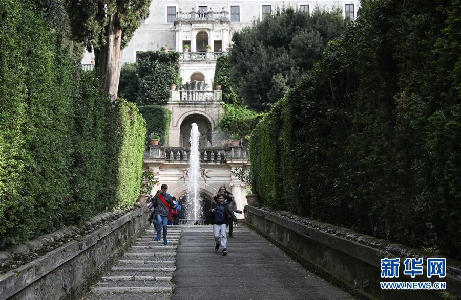 2019年4月17日,在意大利蒂沃利,人们在埃斯特庄园中游览。埃斯特庄园位于意大利蒂沃利,面积约4.5公顷,是文艺复兴时期的文化艺术成果之一。埃斯特庄园是典型的意大利台地园,主建筑物在高地边缘,后面的园林建在陡峭的山坡上。2001年,埃斯特庄园被列入世界文化遗产。新华社记者程婷婷摄