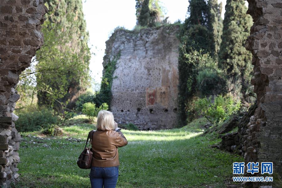 2019年4月14日,游客在意大利奇斯泰尔纳的宁法花园内游览。宁法花园建于十九世纪二十年代,是一座英式花园。花园面积约为8公顷,内有中世纪的遗迹、超过1300种植物以及100种鸟类栖息。新华社记者程婷婷摄