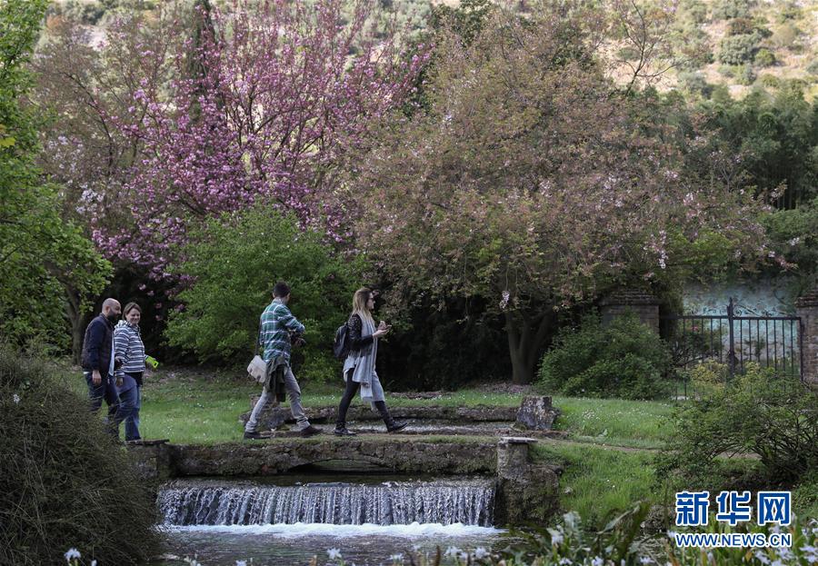 2019年4月14日,游客在意大利奇斯泰尔纳的宁法花园内游览。宁法花园建于十九世纪二十年代,是一座英式花园。花园面积约为8公顷,内有中世纪的遗迹、超过1300种植物以及100种鸟类栖息。新华社记者程婷婷摄