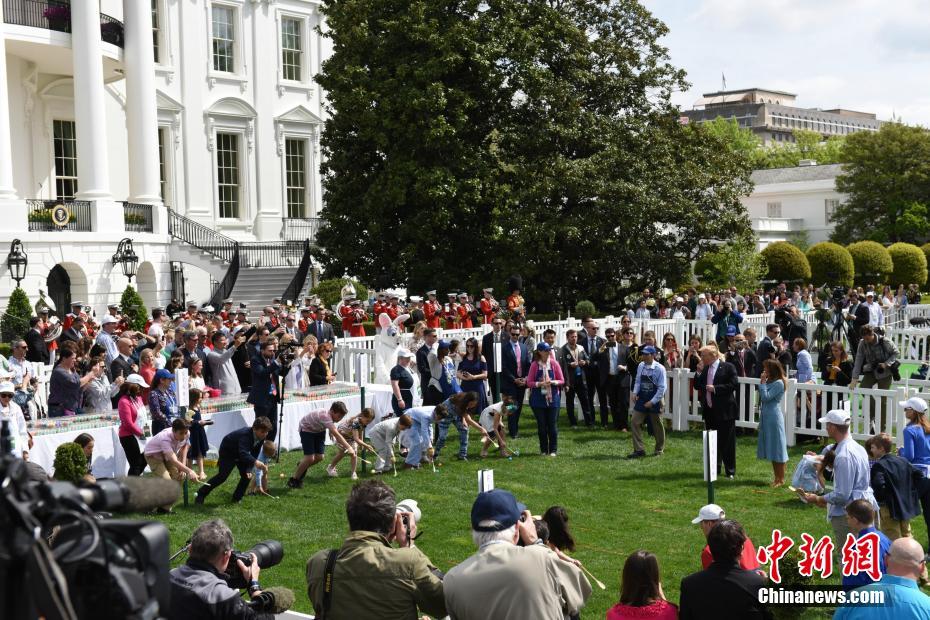 当地时间4月22日,美国白宫举行一年一度的复活节滚彩蛋活动。图为美国总统特朗普和第一夫人梅拉尼娅在白宫南草坪为活动开哨。 中新社记者 陈孟统 摄