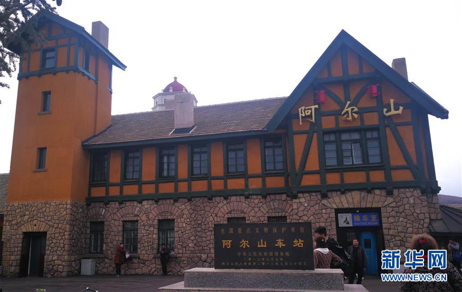 游客在全国重点文物保护单位阿尔山车站参观(4月17日摄)。 新华社记者 李云平 摄