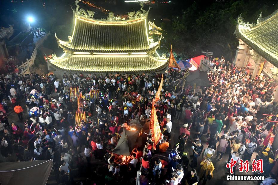 4月27日凌晨,海内外妈祖信众齐聚“妈祖故里”福建湄洲岛,一起庆祝妈祖1059岁诞辰,更有妈祖信众守夜“抢头香”祈福。图为妈祖信众在湄洲岛妈祖祖庙前“抢头香”祈福。中新社记者 吕明 摄
