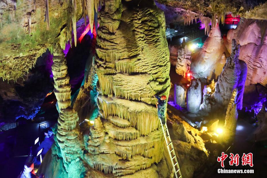 4月29日,五一假期将至,河南洛阳鸡冠洞景区,工作人员对溶洞内的亿年钟乳石进行清洗保养维护。据介绍,河南洛阳鸡冠洞是一座典型的石灰岩溶洞,形成时间达亿年之久,洞内钟乳石千姿百态,景观林立,有着极高的观赏价值和科研价值,被誉为“北国第一洞”。中新社记者 王中举 摄