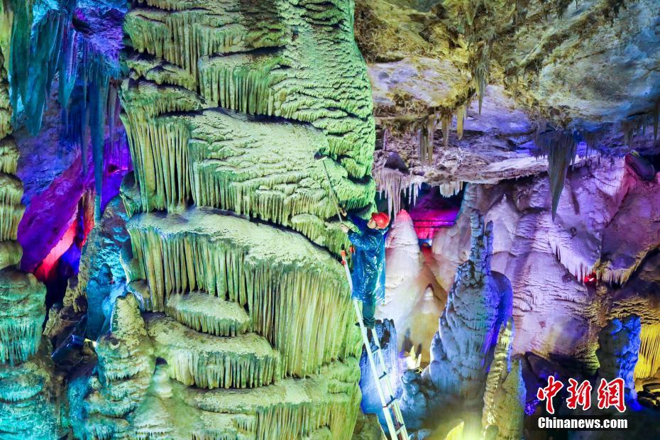 4月29日,五一假期将至,河南洛阳鸡冠洞景区,工作人员对溶洞内的亿年钟乳石进行清洗保养维护。据介绍,河南洛阳鸡冠洞是一座典型的石灰岩溶洞,形成时间达亿年之久,洞内钟乳石千姿百态,景观林立,有着极高的观赏价值和科研价值,被誉为“北国第一洞”。中新社记者 王中举 摄