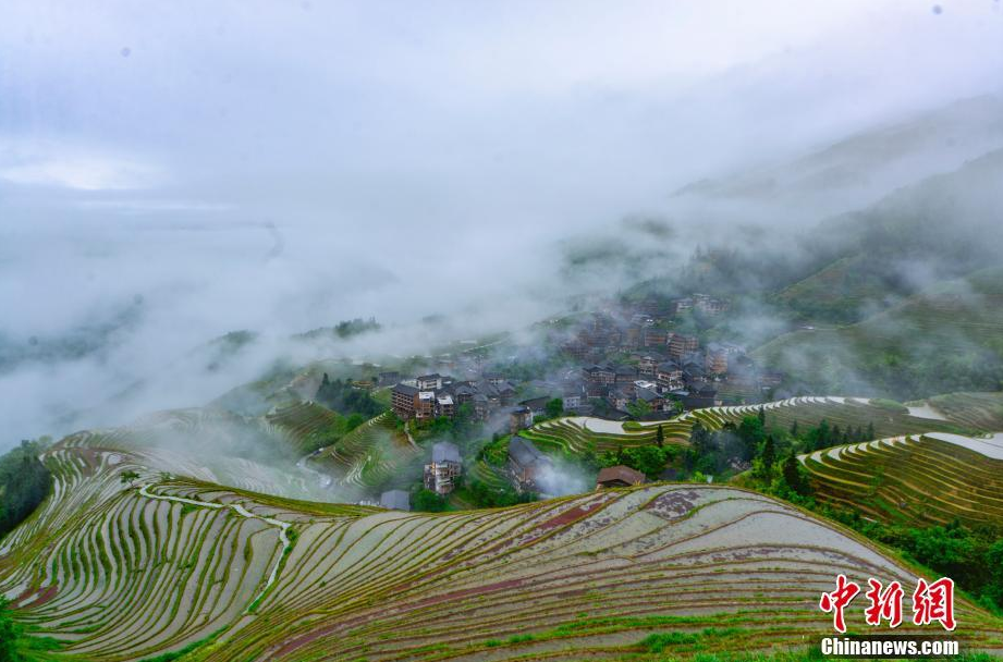 这是5月5日拍摄的广西桂林市龙胜各族自治县龙脊梯田云雾景观。目前,广西桂林市龙胜各族自治县龙脊梯田进入全面备耕季节,梯田水满田畴,雨后云雾缭绕,开启今年最佳的观光和摄影模式。潘志祥 摄
