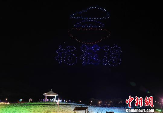 无人机在夜空中组成一幅精美的团案。 吴彬 摄