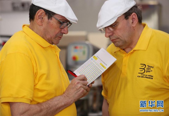 5月11日,在法国巴黎圣母院附近举行的第24届面包节上,面包师记录法棍的相关数据。 新华社记者高静摄