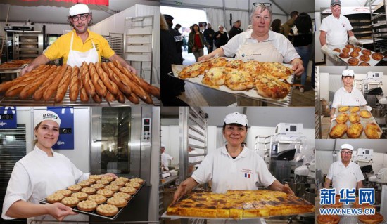 这张拼版照片显示的是,5月11日,在法国巴黎圣母院附近举行的第24届面包节上,面包师展示新鲜出炉的面包和甜品。新华社记者高静摄