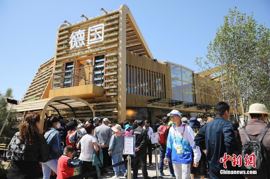 5月13日,北京世园会首个国家日——德国国家日活动成功举办。德国展园主题为“播种未来”,激励每个人融入绿色生活之中,创造更加健康、更加美好的现代城市生活。图为观众排队等待参观德国展园。