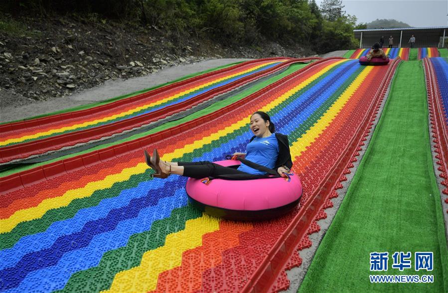 5月13日,游客在湖北省宣恩县二台坪村的游乐场体验滑草乐趣。 湖北省恩施土家族苗族自治州宣恩县沙道沟镇二台坪村是个三面临崖的高山乡村,在实施精准扶贫过程中,于2018年修通了进村水泥路。随着交通条件的改善,当地村民联合成立旅游经营公司,推进以绿色生态为底色的“多彩乡村游”,让昔日沉寂的乡村变得多姿多彩。 新华社发(宋文 摄)