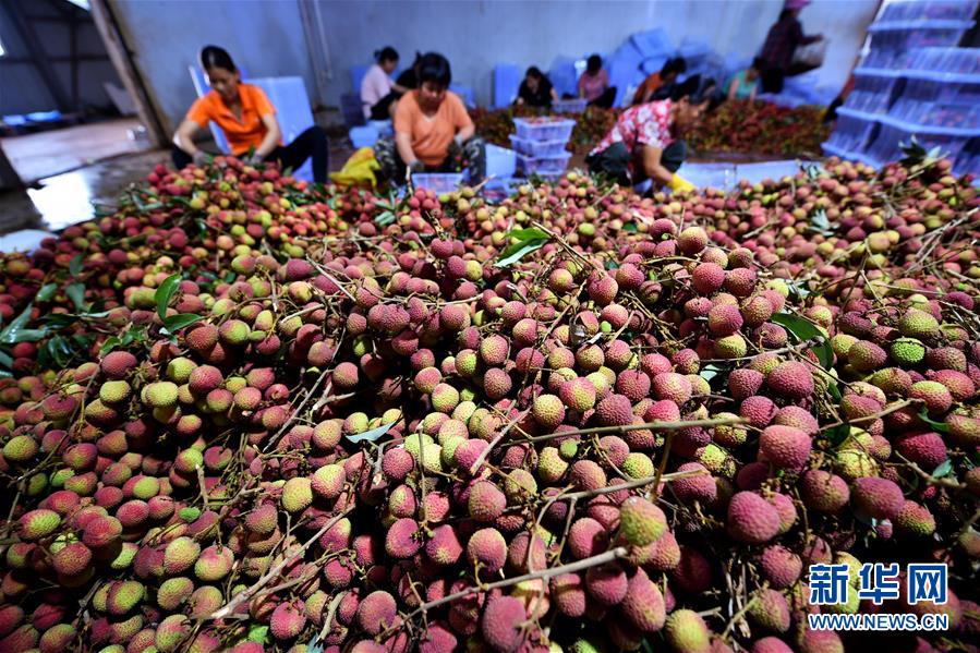 5月15日,海口市荔枝共享农庄的工作人员在分拣荔枝。 近日,海南省海口市各大果园的荔枝陆续成熟,果农抢抓农时进行采摘、销售。 新华社记者 郭程 摄