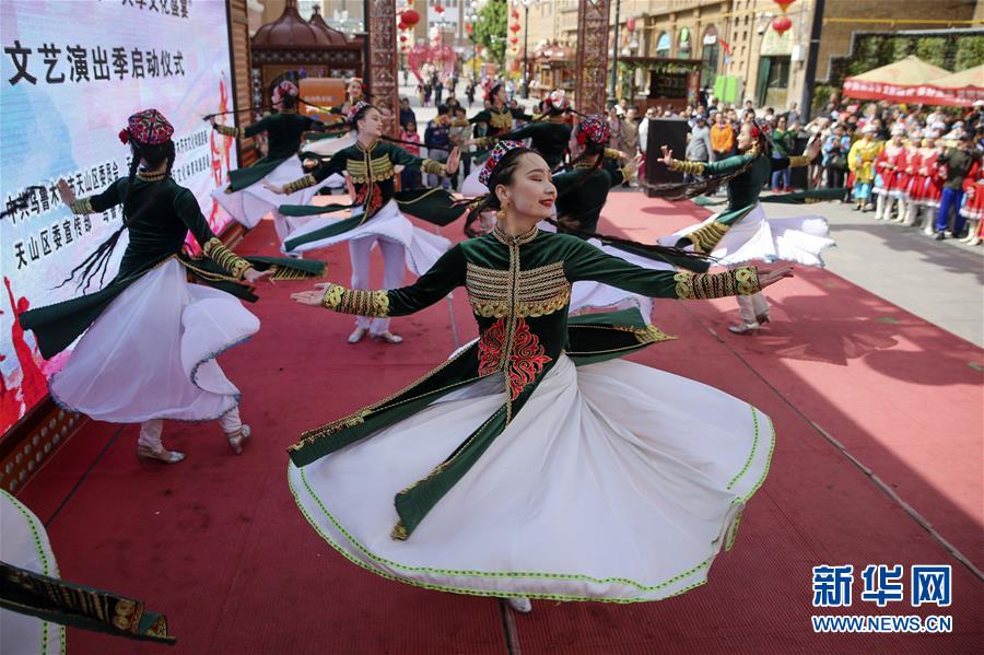 5月19日,演员在活动现场表演舞蹈。 当日,2019年“中国旅游日”乌鲁木齐市天山区分会场活动暨“诚邀四海宾客·共享文化盛宴”文艺演出季启动仪式在乌鲁木齐大巴扎步行街举行。 新华社记者 王菲 摄