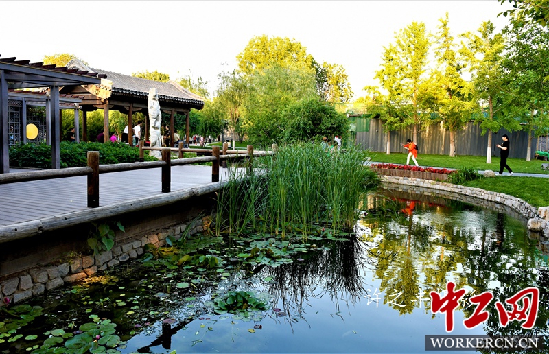 2019年5月21日,走进北京城市中心大栅栏地区的街心花园,这里以森林形态的植物景观为特色,将古建筑包裹在森林之中,仿古凉亭、青砖步道、各类花草环绕着曾经埋入地下几十年的古三里河,仿佛置身江南水乡。工人日报-中工网许之丰摄影报道