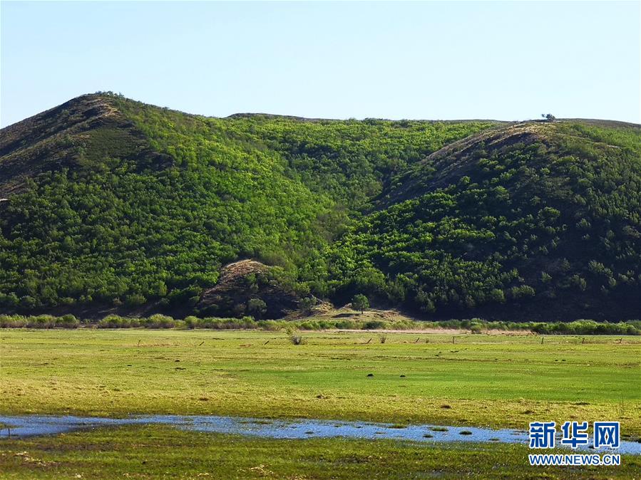 这是5月22日拍摄的内蒙古兴安盟境内一处山峦、草原和湿地风光(手机拍摄)。 近期,随着降雨量增多、气温回暖,内蒙古草原陆续进入返青期。 新华社记者 殷耀 摄