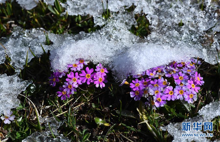 在年保玉则,野花上的冰雪渐渐消融(5月21日摄)。 年保玉则位于青海省果洛藏族自治州久治县境内,地处三江源国家公园核心区,主峰海拔5369米。年保玉则周围森林茂密,湖泊星罗棋布,栖息着裸鲤、岩羊、白唇鹿、棕熊等珍稀动物。 新华社记者 张宏祥 摄