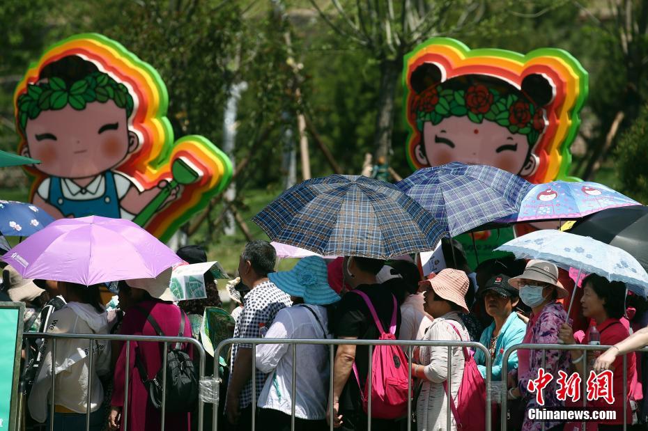 5月22日,游客在北京世园会中国馆门口排队等待,并通过打伞、戴帽子等方式遮阳防晒。当日,京城启动“高烤”模式。北京市气象台于日前发布高温黄色预警,预计22日至25日,北京大部地区日最高气温将达35℃以上,其中23日的局地最高气温可达37℃以上。中新社记者 盛佳鹏 摄