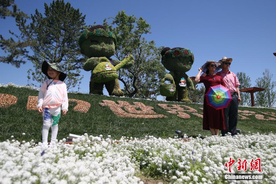 5月22日,游客在北京世园会门口拍照留念,并通过打伞、戴帽子等方式遮阳防晒。当日,京城启动“高烤”模式。北京市气象台于日前发布高温黄色预警,预计22日至25日,北京大部地区日最高气温将达35℃以上,其中23日的局地最高气温可达37℃以上。中新社记者 盛佳鹏 摄
