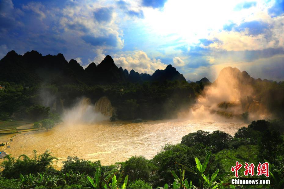 近日,广西多地遭受强降雨袭击,位于广西崇左市大新县境内的德天瀑布水量暴涨,颜色变浑浊,呈现难得一见的“黄金瀑布”壮观景象。在中越界河归春河上游,德天跨国瀑布气势磅礴,与紧邻的越南板约瀑布相连,是亚洲第一、世界第四大跨国瀑布。图为5月27日拍摄于广西崇左市大新县境内的德天瀑布景观。杨虎旺 摄